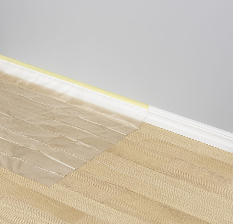 Lägg täckplast på golvet för att skydda mot färgstänk. Fäst täckplasten på listerna så att färgen inte kan rinna igenom. Täckplasten kommer i en smidig, påfyllningsbar hållare som gör det lätt att riva av plasten.
