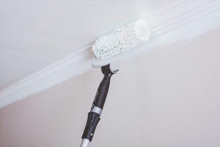 Efter listerna målar du taket med en roller och glöm inte bort att fortsätta använda förlängningsskaftet.