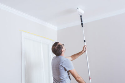Fäst täckplast ovanför skåp och lådor, så att plasten går att rulla upp. Då kan du använda köket mellan strykningarna.
