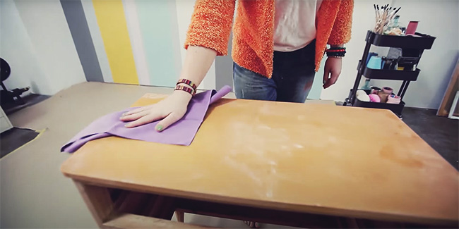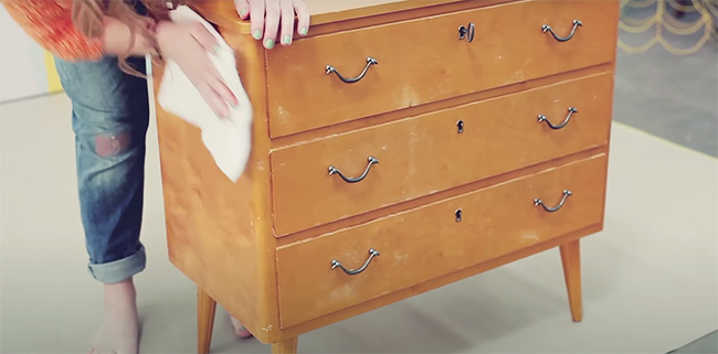 Slipa därefter hela byrån och tillhörande lådor med slippapper. Detta gör man för att färgen fäster bättre på en yta som är uppruggad istället för en som är helt slät. Torka sedan bort slipdammet med en trasa eller mikrofiberduk.