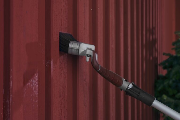 Anza rödfärgspensel med förlängningsskaft målar med falurödfärg på husfasad