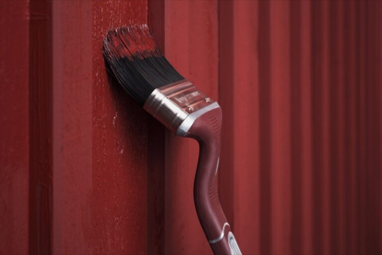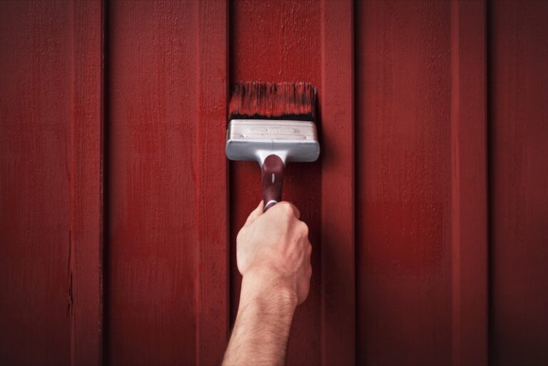 Anza vinklad rödfärgspensel målar med falurödfärg på hus