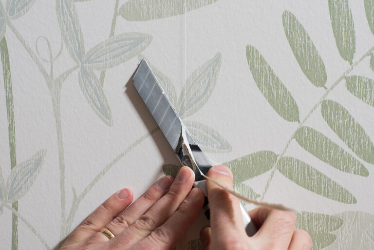 Om tapeten sitter som den ska, skär du bort eventuella överlappande skarvar mellan tapetvåderna. Det enklaste verktyget att använda för detta är en tapetskarvhyvel. Är du säker på hand går det också bra att använda en brytbladskniv. Men om du har en strukturerad tapet ska du undvika att skära bort skarven, eftersom du då får släta ytor som ränder på väggen när du målar.