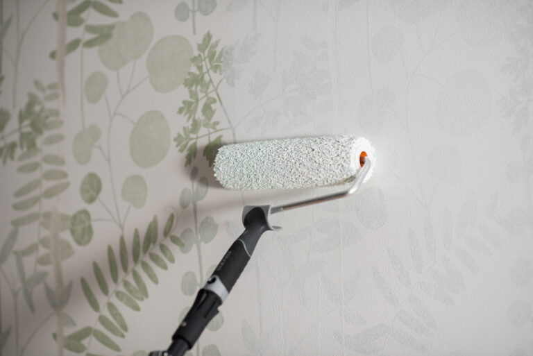 När väggarna torkat efter grundmålningen gör du en första strykning med väggfärg på tapeten. Precis som i grundmålningen använder du först en pensel längst lister och kanter. Efterstryk med en miniroller för att få samma struktur på hela väggen.