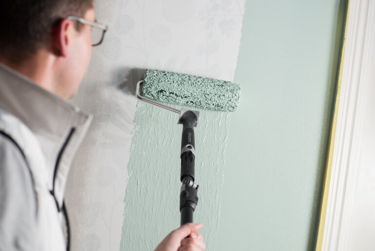 Använd en miniroller närmast de sparmålade ytorna vid kanter och lister, så får du samma struktur som på resten av väggen – och du undviker kladd på listen.