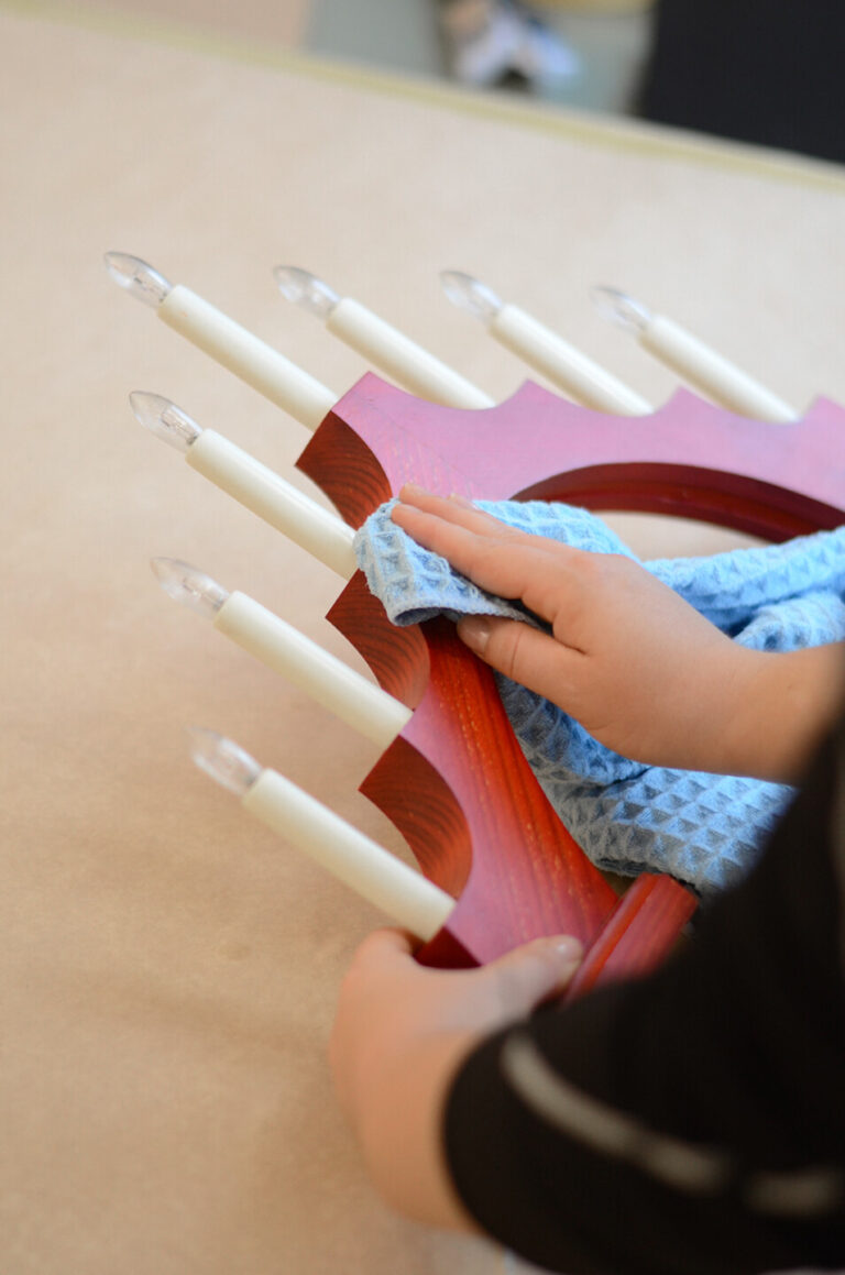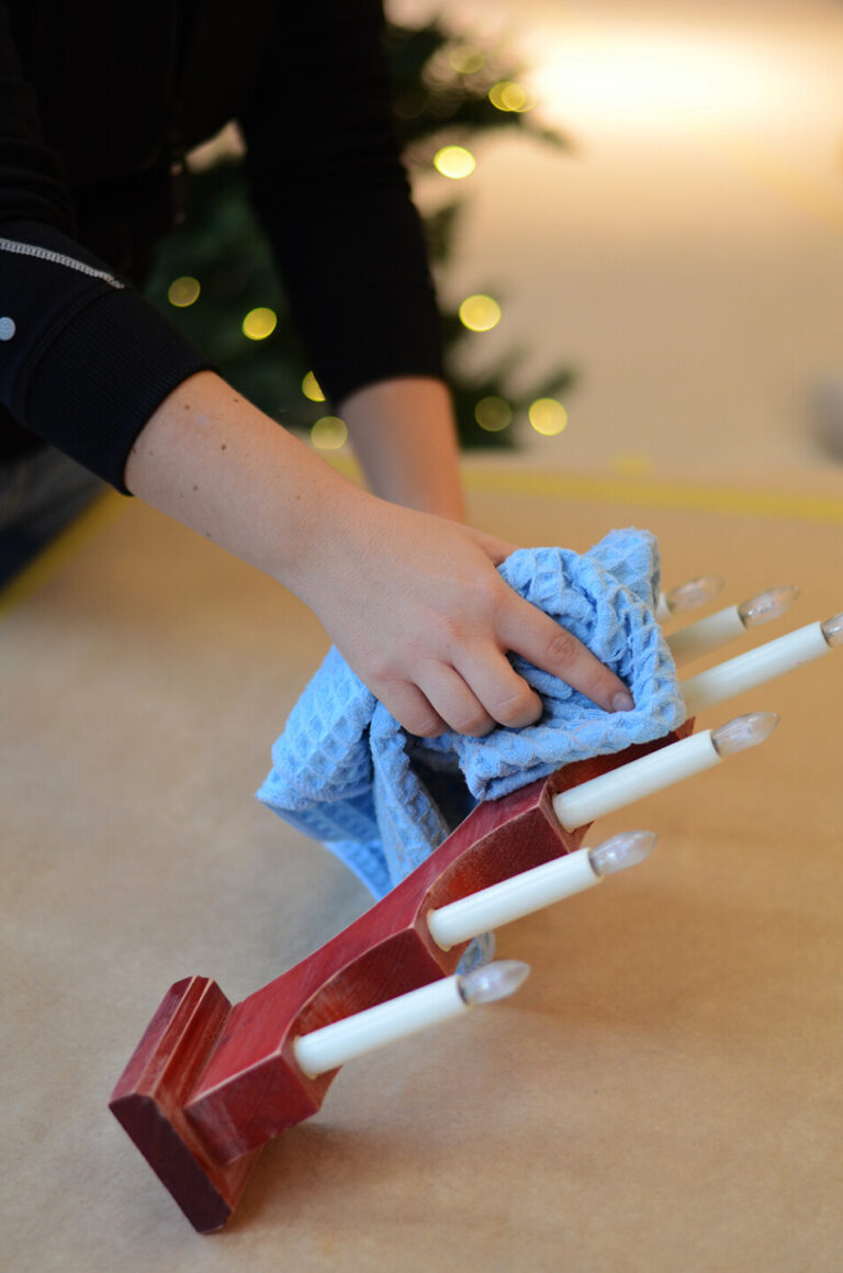 Innan du sätter igång, se till att täcka över exempelvis bordet som du ska arbeta vid. Se sedan till att din adventsljusstake är ren. Använd en mikrofiberduk och torka av staken. Har din adventsljusstake mycket fettfläckar eller liknande kan du med fördel även använda en målartvätt.
