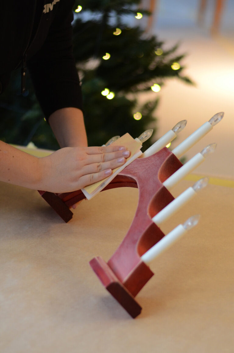 Slipa sedan all yta som ska målas på adventsljusstaken med ett slippapper, P120 brukar vara lagom. Detta gör du för att rugga upp ytan lätt, så att färgen fäster bättre. Torka sedan av slipdammet med mikrofiberduken.