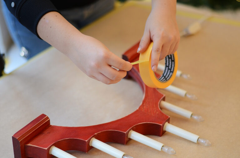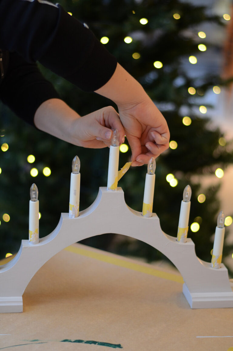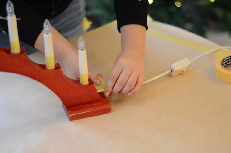 Sen är det dags att maskera de ytor som inte ska målas, så som ljusen och sladden. Maskera gärna hela ljusen om du vill vara säker på att inte få något färgstänk på dessa.