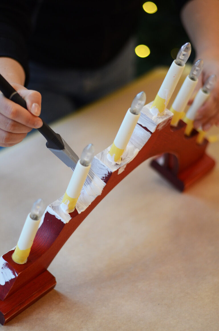Sen är det dags att börja måla om din adventsljusstake i en kulör du gillar! Använd snickerifärg och precis som innan, måla med en snedställd lackpensel på de större ytorna och en precisionspensel vid detaljer.