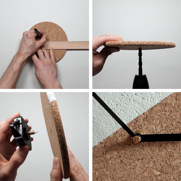 Skapa en unik väggklocka genom att borra hål i mitten av underlägget och sätta dit ett urverk.