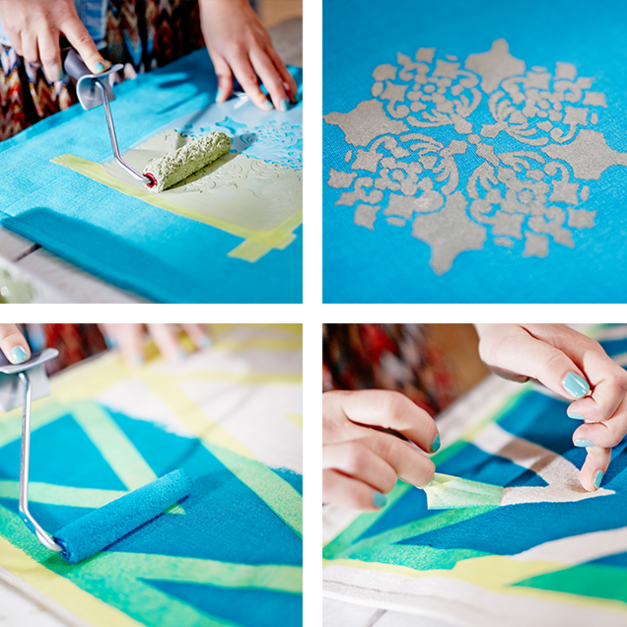 Först är det dags att bestämma hur kuddfodralen ska målas. Det funkar att använda sig av maskeringstejp för att skapa egna mönster eller använda sig av färdiga schabloner.