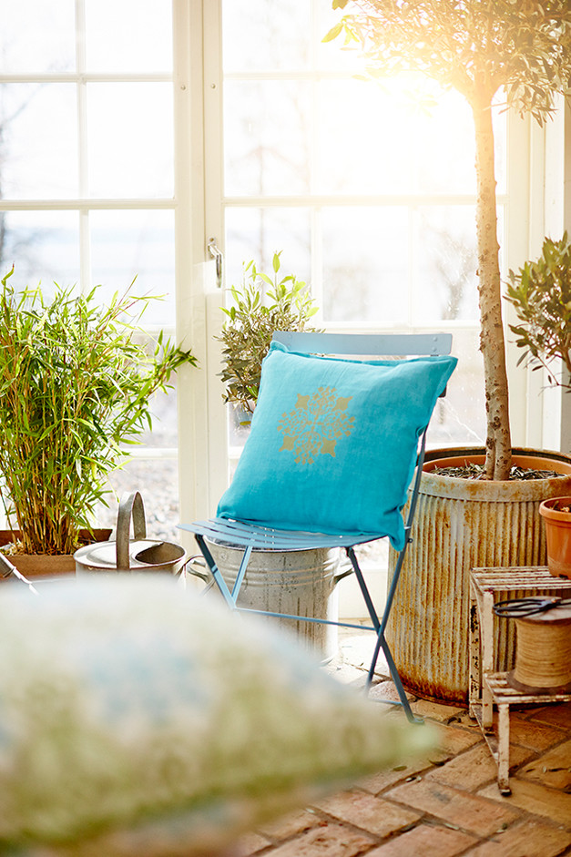 Att ge gamla stolar, skåp och andra möbler ny färg är något som många har provat någon gång. Målning av kuddar är kanske inte lika vanligt, men med lite noggrannhet och fantasi är det enkelt att få ett fint resultat. Här använder vi textilfärger i olika kulörer och målar kuddfodralen med en roller. Kuddarna får genast en ny och egen stil och man kan med enkla medel piffa upp gamla kuddfodral som redan finns hemma.