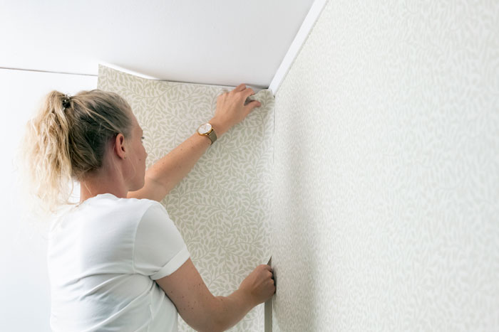 Skär till våden som ska överlappa hörnet med tapetkloss och tapetlinjal. Spara delen som blir över till nästa moment.
