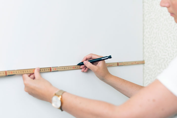 Mät nu bredden på delen som blev över i föregående moment. Markera sedan ut måttet på väggen och rita en lodlinje.