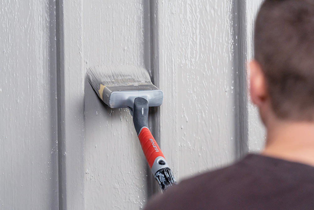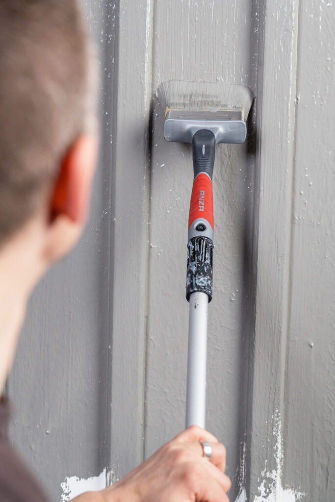 Börja med att låta en roller för fasadmålning täcka in de stora ytorna – och efterstryk sedan med pensel. Extrautrustar du dessutom med förlängningsskaft maximerar du effektiviteten!