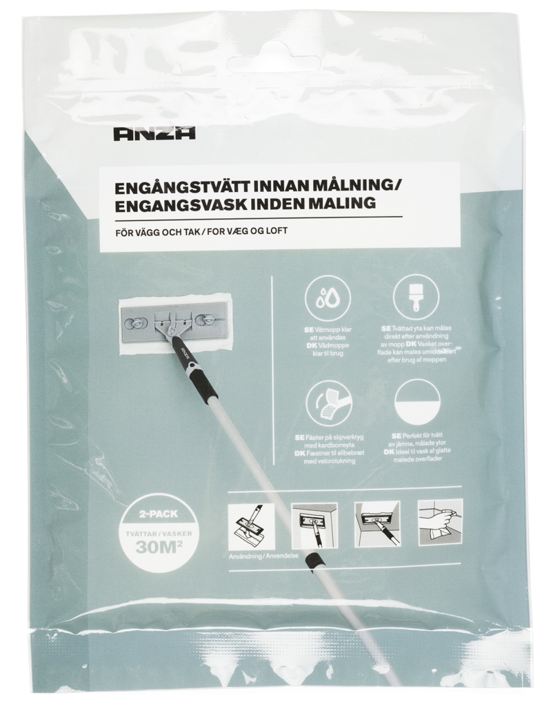 Dags att börja måla? Då är det viktigt att du har gjort ett bra förarbete och rengjort ytan du ska måla på. Vår engångstvätt är redo att användas direkt från påsen och är perfekt för rengöring av tidigare målade ytor inomhus som väggar, tak, lister och möbler. Den kan fästas på vårt slipverktyg med kardborreyta för att få en ökad räckvidd. Förpackningen innehåller 2 st dukar som räcker till 30 m2. Ytan kan målas på direkt efter tvätt.