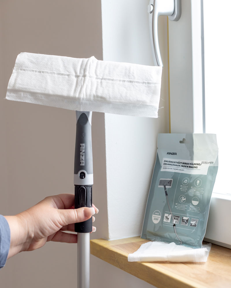 En vanlig miss är att inte rengöra ytorna ordentligt innan man börjar måla. Smuts och fettfläckar kan göra att färgen fäster sämre. Anzas engångstvätt är perfekt för rengöring av tidigare målade väggar och tak, inte minst för att dukarna kan fästas på slipverktyget med kardborreyta.